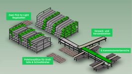 Kostengünstig und schnell können Sie bereits mit einem Fb Single Hub mit bis zu 6 Verpackungsbereichen starten. Die gespiegelten Regalzeilen verkürzen die Kommissionierwege und den Zeitbedarf. Das Pick-to-Light System ist dabei entscheidend für die schnelle und sichere auftragsbezogene Kommissionierung durch die Mitarbeitenden. Zudem sinkt die Fehleranfälligkeit auf ein Minimum. Schnelldreher und Großteile werden auf Paletten zur Verfügung gestellt.