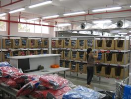 Anders als in westeuropäischen Ländern sind die Personalkosten in Asien vergleichsweise günstig. So ist der manuelle Anteil in den Prozessen häufig höher. Das ist auch in der von Klinkhammer ge-planten Anlage nicht anders. Aus den Top-Eagle-Produktionen in Heshan und Hubei kommen die Textilien auf Trolleys und in Bündeln zu den neuen Vereinnahmungsplätzen. Für die eindeutige Identifizierung werden sie einzeln eingescannt und zur Einlagerung in Waben mit der Put-to-Light-Technologie vorsortiert. Die Einlagerung selbst erfolgt über W-LAN angebundene Pick-Mobile – gleichfalls mit der Put-to-Light-Technologie.