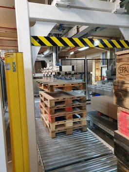 Auf der zweiten Anlage werden bereits in Karton verpackte Möbelteile auf Paletten gestapelt. Diese Anlage besteht aus einem Roboter und einer Linear-Robotik-Anlage, die die benötigte Palette vom Stapel nimmt und abwechselnd auf zwei verschiedene Rollenbänder platziert. Sowohl der Industrieroboter als auch die Linear-Robotik-Anlage sind jeweils mit einem EOAT bestehend aus sechs einzelnen KENOS® KVG Vakuumflächengreifern ausgerüstet. Von einem aus der Verpackungsstation laufenden Rollenband werden die einzelnen Lagen verpackter Möbelteile zum Roboter verbracht. Jede Lage besteht aus bis zu vier Kartons und wird als Lage von dem Roboter aufgenommen und auf die Palette gelegt, bis die gewünschte Lagenzahl erreicht ist. Dann läuft die Palette über ein weiteres Rollenband zu einer Aufnahmestelle für Gabelstapler.