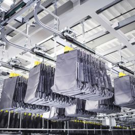 Die großen Vorteile der Hängefördertechnik bei der Warensortierung können auch für Liegewaren wie Shirts, Schuhe oder andere liegende Güter genutzt werden.